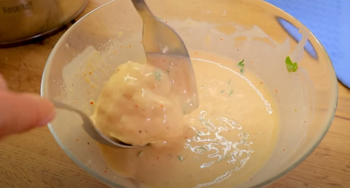 Mezitím si připravte dip smícháním bílého jogurtu, kečupu, majonézy a lisovaných česnekových stroužků. Pokrm podávejte teplý. Přejeme vám dobrou chuť!