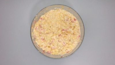 Ke květáku přidejte vejce, olej, nahrubo nastrouhaný tvrdý sýr, hrubou mouku, sůl, mletý pepř, na malé kostičky nakrájenou anglickou slaninu, nadrobno nakrájenou cibuli a prolisovaný česnek.