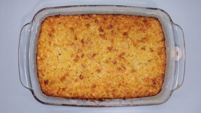 Do připraveného pekáče rovnoměrně rozprostřete květákovou směs a uhlaďte ji. Nákyp vložte do trouby předehřáté na 175 °C a pečte ho přibližně 70 minut, dokud nezezlátne.