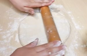 Výsledkem by mělo být těsto pevné, soudržné a nelepivé konzistence. Zformujte z něho kouli, její povrch potřete olejem, stejně jako stěny mísy, kterou zakryjte přilnavou potravinářskou fólií a nechte těsto při pokojové teplotě kynout 40 minut. Poté ho vyklopte na pomoučněný vál, znovu ho rukama propracujte a vytvarujte z něho válečkem kulatou tenkou placku.