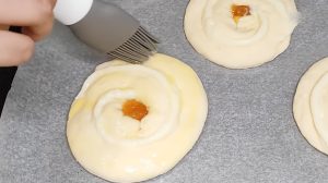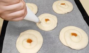 Kráječem na pizzu rozkrájejte placku na pruhy o šířce 3 centimetry. Každý proužek stočte do tvaru šneku a konec důkladně zamačkejte, aby se tvar nerozbaloval. Vyskládejte šneky na plech vyložený pečicím papírem. Doprostřed udělejte důlek, který zaplňte meruňkovým džemem a s pomocí zdobicího sáčku vytvořte spirálu z pudinku.