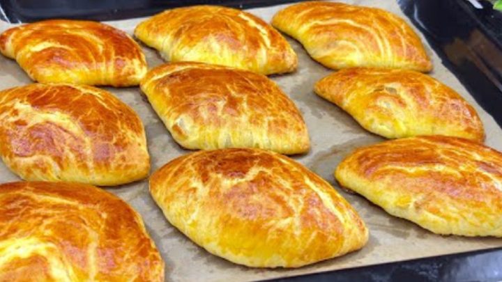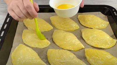 Naplněné kousky těsta vyskládejte na plech, vyložený pečicím papírem, potřete je vaječným žloutkem a pečte je v předehřáté troubě na 190 °C po dobu 15–20 minut, dozlatova.