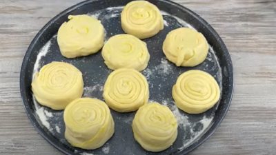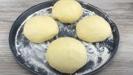 Z ingrediencí vytvořte těsto které rozdělte na 4 stejné části. Z nich vytvořte bochánky, které zakryjte a nechte kynout 10 minut na teplém místě.