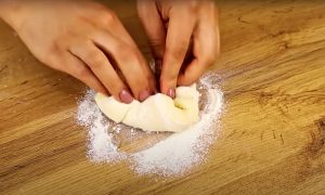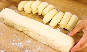 Z vykynutého těsta jemně vytlačte vzduch. Pracovní plochu posypejte hladkou moukou a vyklopte na ni těsto, které zformujte do bochánku a přitom ho celé obalte tenkou vrstvičkou mouky. Bochánek rozdělte na dvě poloviny a každou z nich rozkrájejte na 10 malých kousků.