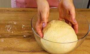 Do misky nalijte teplé mléko, přidejte 10 gramů instantního droždí, lžičku soli a tři lžíce cukru. Metličkou vše dobře promíchejte. Ihned do směsi přidejte dvě vejce a 50 gramů rozpuštěného másla. Opět vše promíchejte do hladké směsi. Pro podporu kynutí přidejte ještě prášek do pečiva a polévkovou lžíci octa. Po promíchání celou směs zaprašte přes sítko hladkou moukou a zadělejte hutné, mírně lepivé těsto.