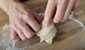 Těsto vyklopte na pomoučněný vál a rozdělte na 9 dílů. Z každého vyválejte kulatou placku. Tu pak kolečkem na pizzu rozdělte na osminky jako pizzu, které následně naskládejte na sebe. V polovině je stlačte špejlí, pak je chytněte za vrchol, zatočte a vrchol zatlačte dovnitř. Takto zpracujte všech 9 dílů těsta, dejte je na plech vyložený pečicím papírem, přikryjte a nechte 10 minut kynout.