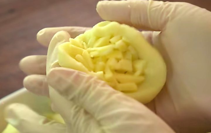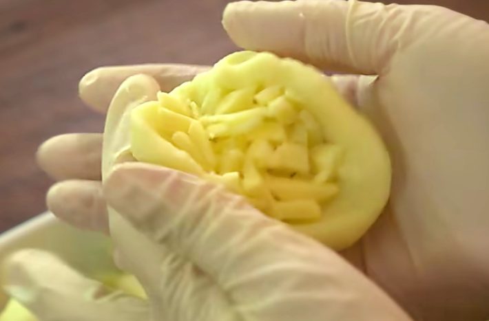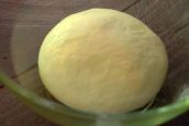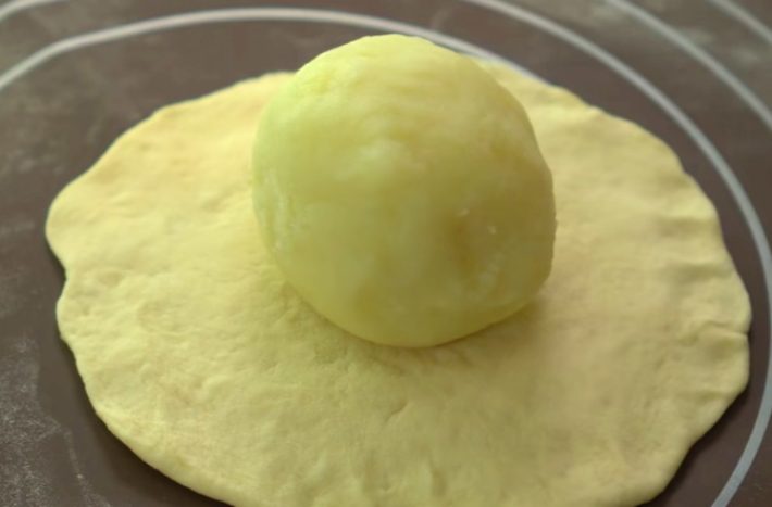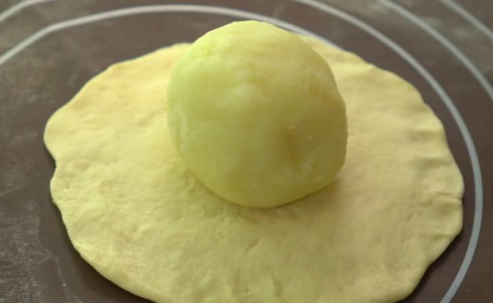 Z každého kousku vytvarujte placičku, kterou naplníte trochou strouhané mozzarelly a uděláte z ní kuličku. Vykynuté těsto rozdělte na osm stejných částí. Udělejte z nich kuličky a ty přikryjte potravinářskou fólií, aby neosychaly. Postupně každou část těsta vyválejte a do jejího středu umístěte bramborovou kuličku.