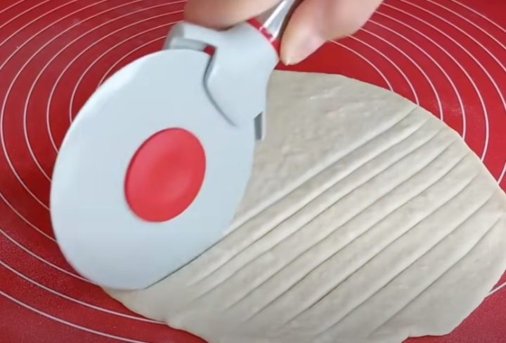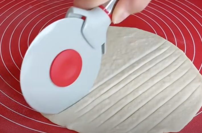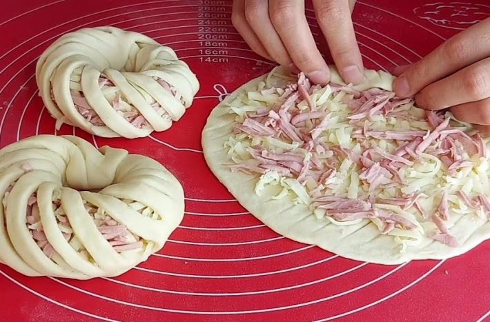 Těsto dejte na vál a rozdělte na 12 dílů. Z každého uválejte tenkou placku, do ní udělejte kolečkem na pizzu několik zářezů, ale okraje neprořízněte. Poté na placku dejte trochu strouhaného sýru a na malé kousky nakrájenou šunku. Každou placku poté srolujte a stočte do kolečka, tak aby se vytvořil věneček (viz video). Okraje utěsněte prsty.