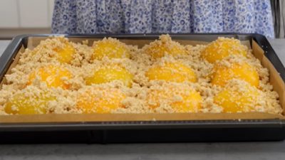 Kynutý broskvový koláč s drobenkou - postup přípravy