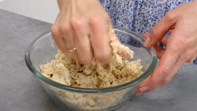 Z ingrediencí uhněťte těsto, které zakryjte vlhkou utěrkou a nechte ho kynout 1 hodinu na teplém místě. Mezitím připravte drobenku.