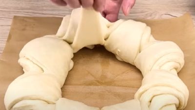 Ve středu posledního plátu vytvořte 8 řezů tak, abyste vytvořili tvar hvězdy. Špičky vzniklých trojúhelníků zahněte směrem k okraji a těsto vložte do zapékací mísy, přikryjte ho utěrkou a nechte ho kynout ještě 25 minut.