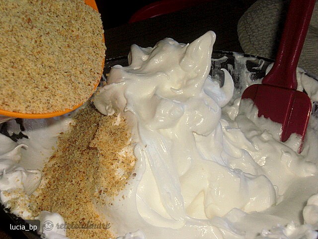 V další fázi si předehřejte troubu na cca 180 °C a pusťte se do tvoření ořechové náplně a kompletace kynutých závinů. V středně velké míse si vyšlehejte vaječné bílky do tuhého sněhu. Postupně do směsi přidávejte moučkový cukr a na závěr vsypte vlašské oříšky a vlijte rum nebo brandy.