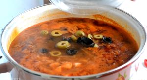 Kyselá polévka Soljanka s vepřovým masem a olivami