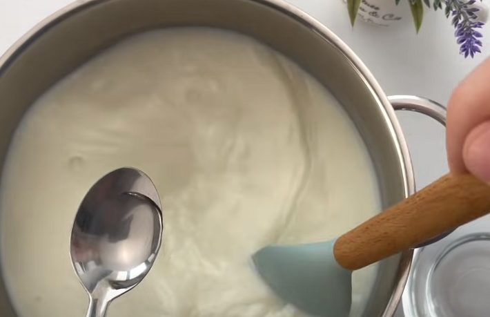 Začněte tím, že si do velkého hrnce nalijete plnotučné mléko. To pak zahřívejte na mírném plamenu (cca 50 °C).