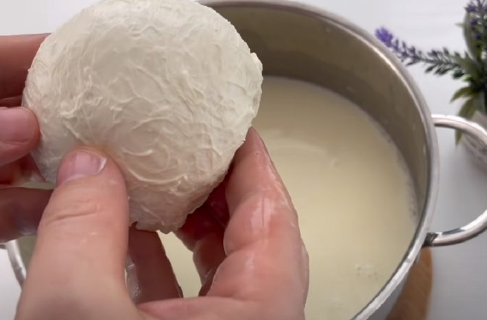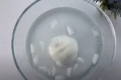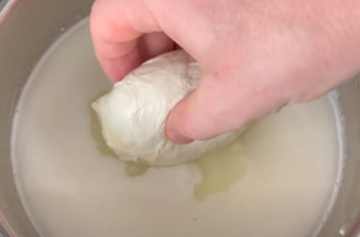Hotovou mozzarellu vyjměte ze syrovátky, ponořte do studené vody s ledem a máčejte asi minutu až dvě.