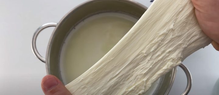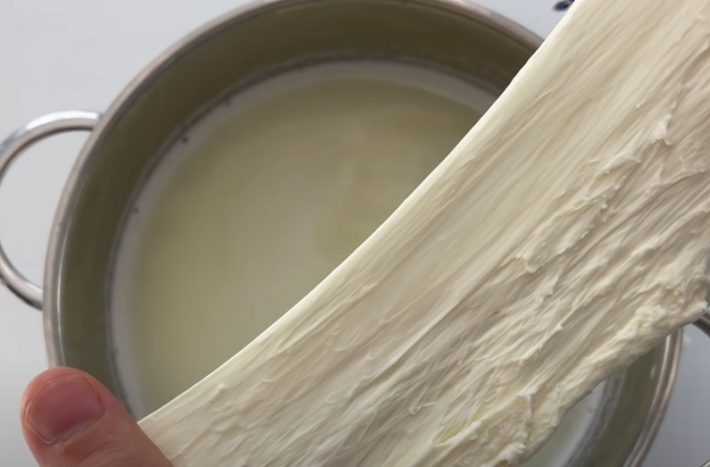 Nakonec teplou tekutinu odstavte a vlijte do ní citronovou šťávu. Neustále vše míchejte, dokud se syrovátka neoddělí od sýru.