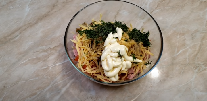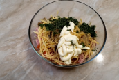 Oba druhy zeleniny vložte do velké mísy a promíchejte rovněž s jemně nasekaným koprem, kostičkami salámu, nahrubo strouhaným sýrem a na závěr směs ještě osolte a opepřete dle preferencí. Vše zakápněte majonézou a důkladně propojte lžící.