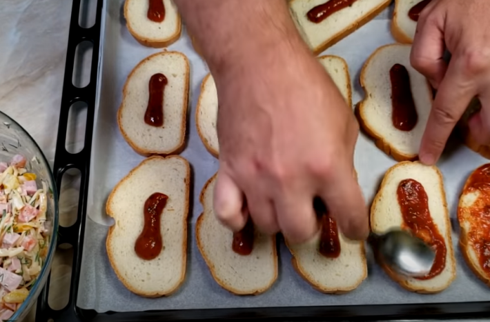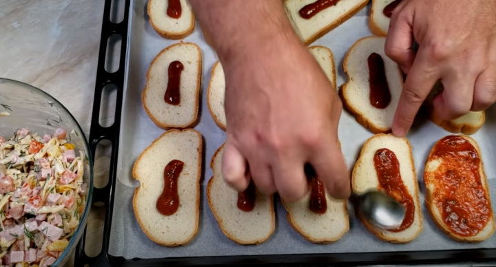 Nyní si k ruce vezměte čerstvou veku nebo bílý chléb a pokrájejte jej na stejně silné plátky. Každý kus pak pomažte trochou sladkého kečupu a naneste na něj i směs zeleniny, sýra a salámu.