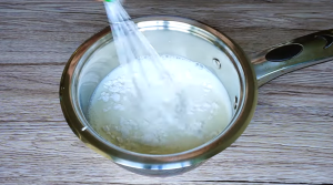 Do menšího kastrůlku nalijte studené mléko. Vsypte do mléka v kastrůlku zhruba tři vrchovaté polévkové lžíce kukuřičného škrobu a důkladně ho metličkou vyšlehejte tak, aby se v mléce úplně rozpustil a nezanechal hrudky. Postavte kastrůlek na kamna a na středním plameni mléčnou směs zahřívejte, dokud se nepřiblíží k bodu varu.