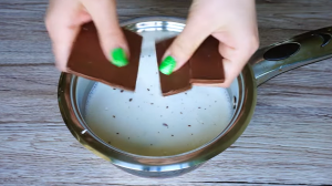 Dvě tabulky mléčné čokolády rozbalte z obalu a rozlámejte je na co nejmenší kousky. Dělejte to ideálně přímo nad zahřívajícím se kastrůlkem s mléčnou směsí, abyste nepřišli ani o jediné zrníčko čokolády. Když je nalámaná, vhoďte čokoládu do horkého mléka a metličkou bez ustání míchejte, dokud se čokoláda nezačne rozpouštět a směs nezačne vřít a houstnout do konzistence pudinku.