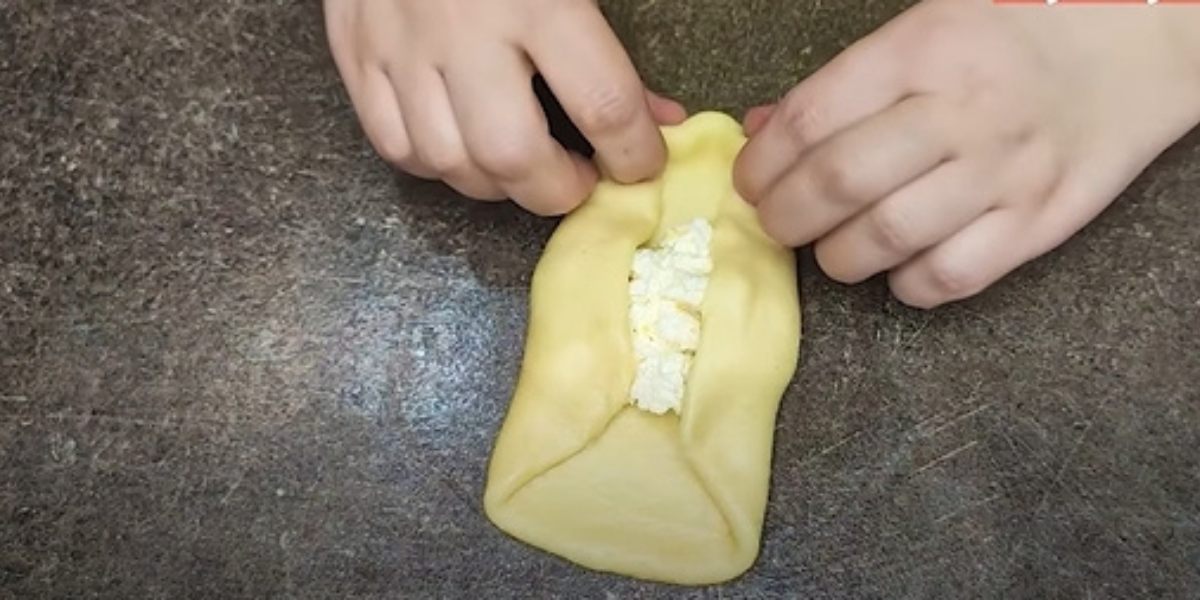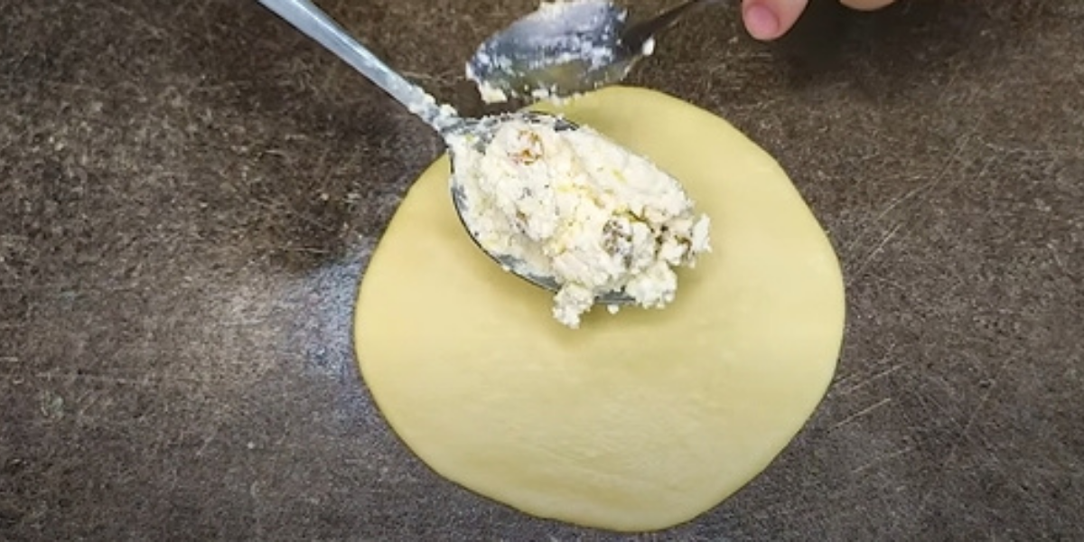 Za hodinu ho vyndejte, rozdělte na 15 stejných částí a udělejte z nich malé placičky. Do středu každé z nich dejte lžíci náplně.