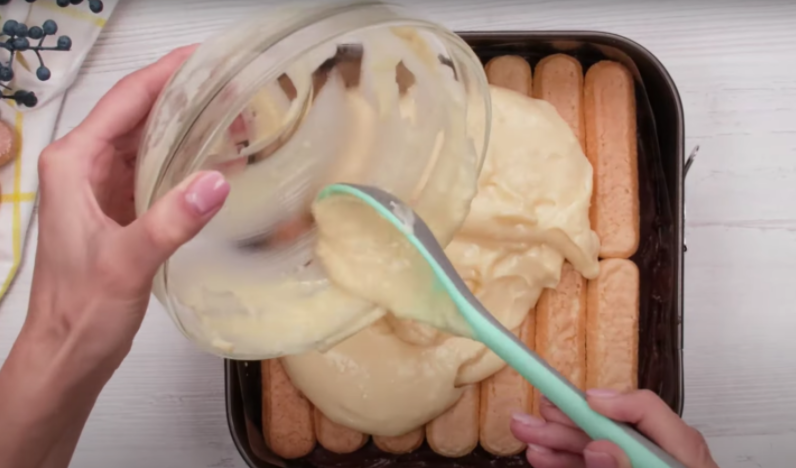 Vezměte si vhodnou formu, ideálně hranatou, vyložte ji pečicím papírem a klaďte na něj vedle sebe polovinu připravených cukrářských piškotů, které jste předtím namočili v mléce.