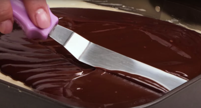 Připravený dezert dejte do ledničky a přichystejte si polevu. Ve vodní lázni přidejte do smetany ke šlehání čokoládu a karamel a míchejte do úplného rozpuštění. Poté polevu nechte trochu zchladnout, vyšlehejte ji pomocí mixéru a přelijte jí zákusek.