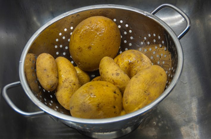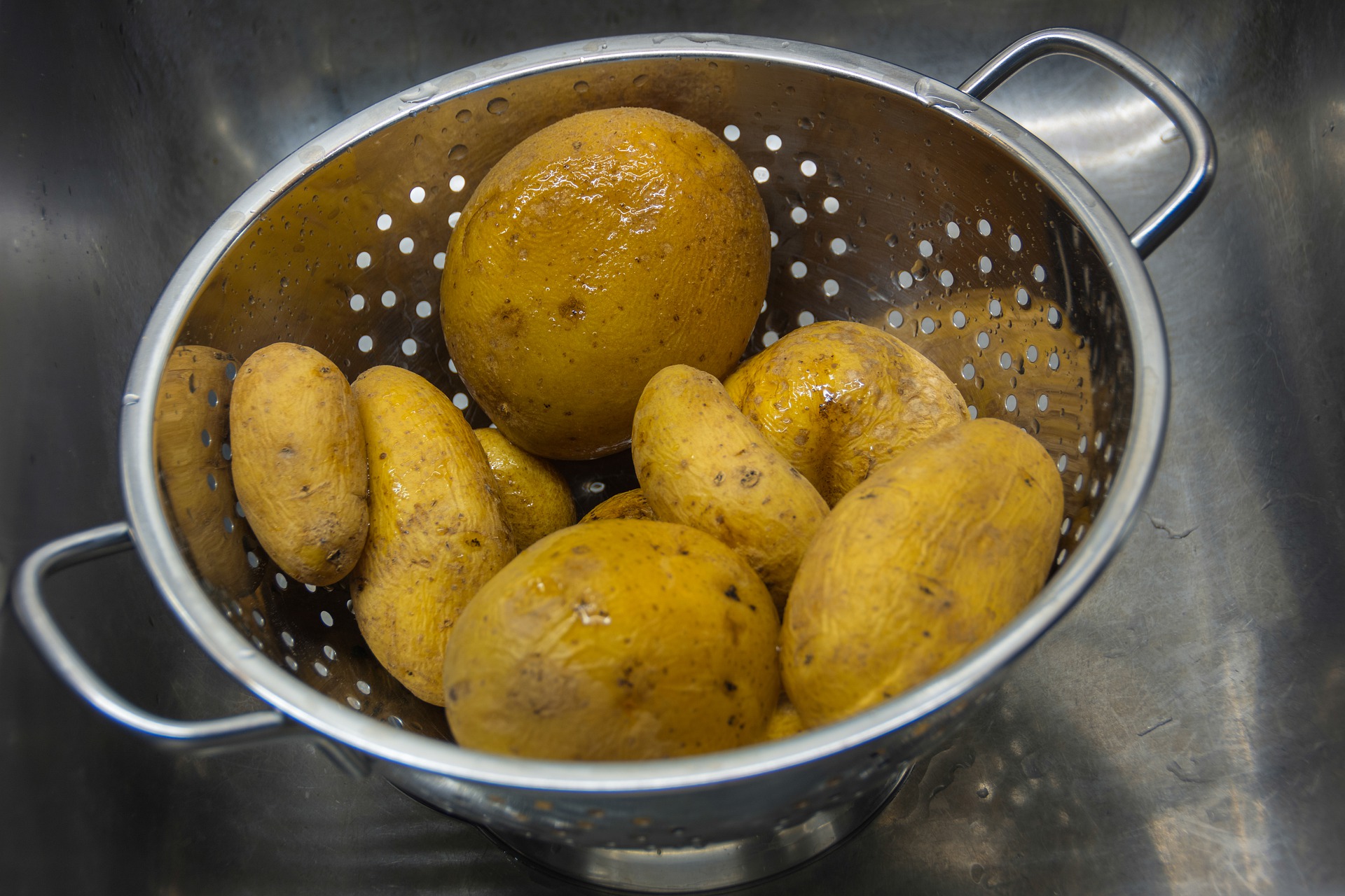 Začněte tradičně tím, že si uvaříte brambory na loupačku v mírně osolené vodě. Až budou měkké, tak je sceďte, nechte zchladnout a poté oloupejte.
