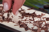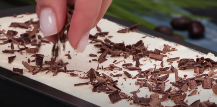 Po vyndání je třeba zákusek také ozdobit. K tomu je možné použít třeba nasekané kousky sušenek, nebo také hoblinky z bílé i černé čokolády. Takto nachystaný dezert je možné také servírovat. Nožem zajeďte do formy a uřízněte jeden plátek. Následně ho opatrně vyndejte a vložte na talířek.