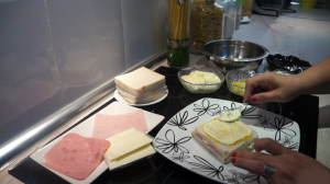 Ingredience v receptu jsou určené na přípravu jednoho sendviče. Pokud jich chcete připravovat víc najednou, jednoduše si množství upravte. Začněte tím, že vezmete jeden plátek toastového chleba a pomažete ho dvěma lžičkami hořčice. Na hořčici namažte dvě lžičky majonézy. Tavený sýr vybalte z obalu a jeden plátek rozložte na majonézu. Poté ho přiklopte plátkem šunky.