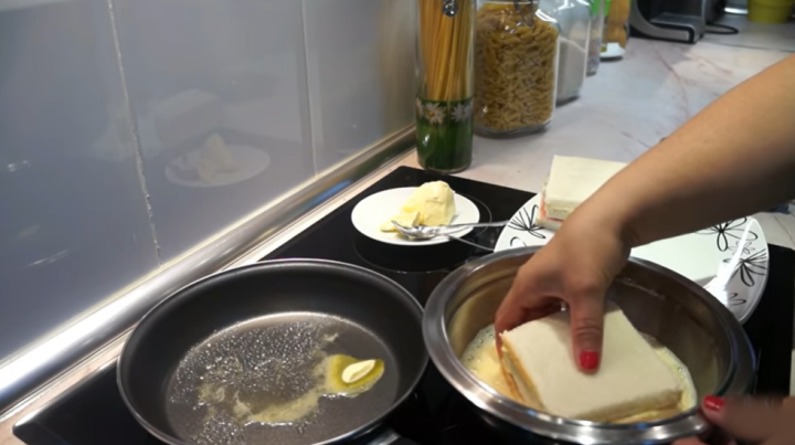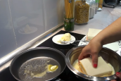 Opakujte postup s plátkem taveného sýru a šunky. Vezměte i poslední krajíc toastového chleba, namažte ho opět hořčicí a majonézou a přiklopte úplně navrch. Ve větší misce vidličkou rozšlehejte dvě vajíčka spolu s mlékem. Vznikne směs, ve které sendvič důkladně obalíte, a to i na bocích.