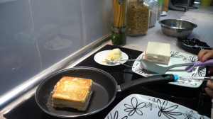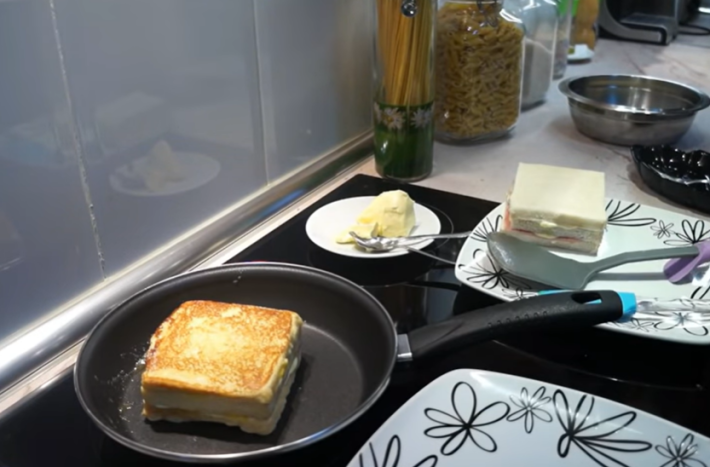 Na pánvi rozpusťte máslo. Položte na ni sendvič, který nejprve z jedné strany osmažíte dozlatova. Pak ho uchopte například kuchyňskými kleštěmi a osmahněte i ze všech stran. Nakonec ho nechte smažit z vrchní strany. Sendvič nechte trochu vychladnout, rozkrojte na dva stejně veliké trojúhelníky a servírujte. Můžete jej podávat jako svačinu nebo lehčí večeři. Pokud chcete, můžete ho třeba ještě teplý posypat strouhaným sýrem.