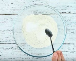 Do hluboké mísy prosejte přes jemné sítko hladkou mouku spolu s práškem do pečiva, abyste se zbavili případných zatvrdlých hrudek. Přidejte vanilkový cukr a všechny suché ingredience velmi dobře lžící promíchejte.