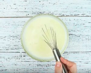 Do jiné misky vyklepněte dvě vajíčka a vyšlehejte je elektrickým šlehačem či tyčovým mixérem do jemné a nadýchané pěny, která má bělavou barvu a pěnivou konzistenci. Přilijte k vaječné pěně mléko a olej a znovu dobře promixujte.