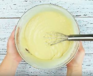 Směs vajíček, oleje a mléka nalijte do mísy se suchými ingrediencemi a velmi dobře obě části zapracujte do sebe, nejlépe tak, aby v těstě nezůstaly žádné hrudky a nerozmíchaná místa. Výsledkem by mělo být hladké, homogenní a polotekuté těsto.