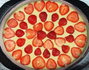 Připravte si dortovou formu nebo plech na pečení, který vytřete tukem a vysypejte moukou, anebo ho vyložte pečicím papírem. Vlijte do plechu či formy těsto, stěrkou ho uhlaďte do roviny. Umyjte jahody či švestky a zbavte je stopek, případně pecek. Omyté ovoce nechte důkladně okapat a osušte je papírovými utěrkami. Ostrým nožem pak dužninu nakrájejte na tenčí plátky, které vyskládejte v soustředných kruzích či čtvercích na povrch těsta.