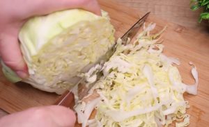 Hlávkové zelí očistěte od svrchních listů, které mívají nejvyšší obsah zbytkových pesticidů a hnojiv použitých při pěstování. Nakrájejte ho ostrým nožem na velmi tenké nudličky, které ještě podle potřeby rozkrájejte na kratší kousky a vložte ho do hluboké mísy.
