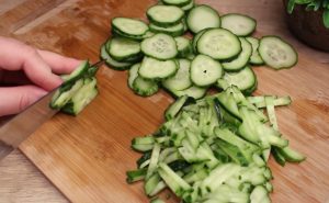 Umyjte okurky, odkrojte z nich špičky z téhož důvodu, jako jste odstraňovali listy ze zelí, a navíc i proto, že špičky obvykle bývají nahořklé. Okurky pak rozkrájejte na kulaté plátky, které rozkrájejte na tenké nudličky. I ty pak přihoďte do salátové mísy.