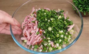 Dušenou šunku nakrájejte ostrým nožem na tenká kolečka. Navrstvěte je na sebe, rozpulte sloupeček na dvě poloviny a každý z nich rozkrájejte na nudličky, stejně jako jste to udělali s okurkami. Čerstvý kopr a petrželku umyjte pod proudem vody a osušte je papírovými utěrkami. Zbavte je pak pevných stopek a listy nasekejte najemno. Šunku, kopr i petrželku přidejte do mísy se zelím a okurkami. Zelenou cibulku rozkrojte na poloviny a nasekejte je na jemná kolečka a přihoďte je k salátu.