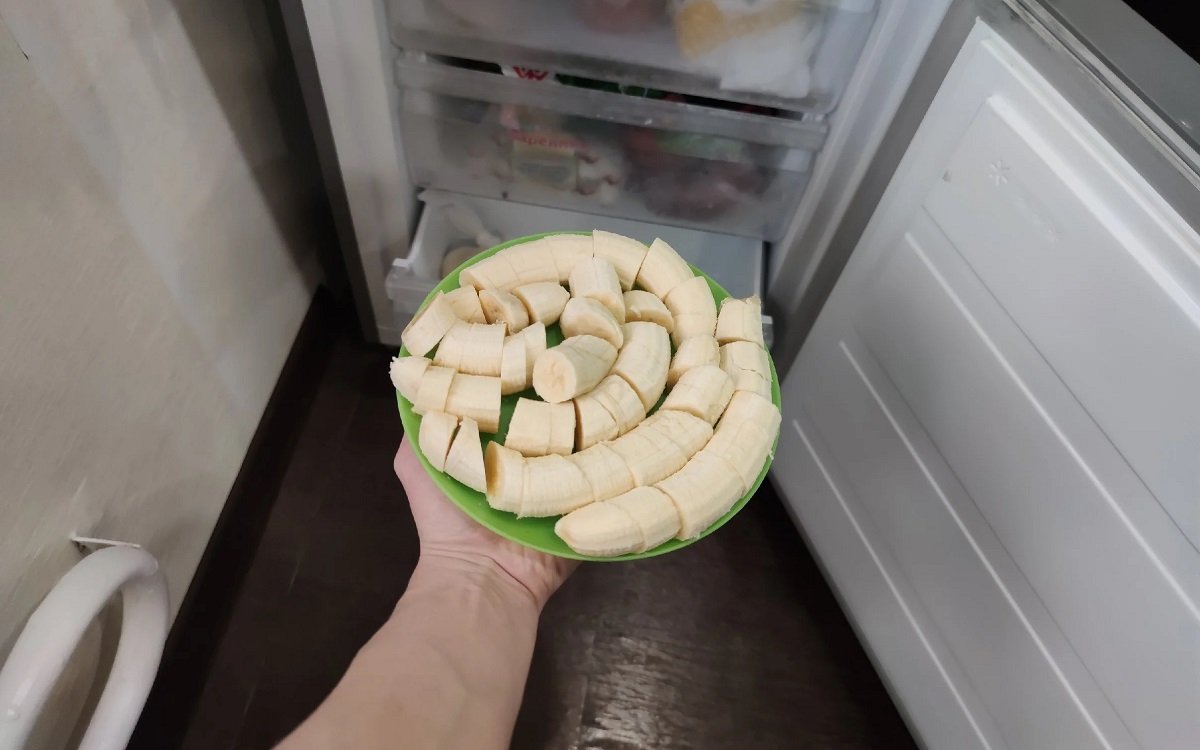 Začněte tím, že si oloupete banány a nakrájíte je na menší kousky.