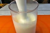 Zatímco se karbanátky smaží, připravte omáčku. Do mísy ponorného mixéru nalijte mléko nebo smetanu na vaření a přidejte tavený sýr. Mixérem obě přísady rozmixujte na homogenní směs, kterou podle chuti dosolte a popřípadě opepřete.