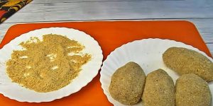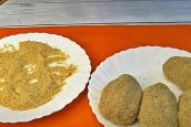 Do směsi vyklepněte jedno vajíčko a přidejte jednu nebo dvě lžíce strouhanky. Maso znovu dobře promíchejte. Pokud by konzistence byla stále příliš řídká, přidejte ještě trochu strouhanky tak, abyste vytvořili soudržné a tvárné těsto. Z něj pak vytvarujte karbanátky ve tvaru šišek a o velikosti dlaně. Obalte je ve strouhance a vyrovnejte je na talíř.