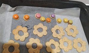 Odleželé těsto rozválejte na tenký plát, z něhož vykrajujte maličká kolečka (případně mohou zbýt jako středy po vykrajování klasického cukroví). Kolečka vyskládejte na plech pokrytý pečicím papírem, doprostřed každého kolečka umístěte lentilku a vložte plech do trouby rozehřáté na 170 °C péct zhruba 8 až 10 minut.