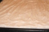 Připravte si plech na pečení a vyložte ho pečicím papírem. Těsto na korpus pak přemístěte pomocí špachtle do plechu a vyrovnejte jeho povrch. Těsto by mělo být tlusté nejvýše 1,5 centimetru. Hodí se na to plech o velikosti 38 x 38 cm. Dejte korpus péct do trouby na 175 stupňů Celsia asi na 25 až 30 minut.