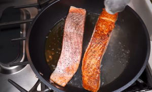 Připravte si dva proužky lososového filetu bez kůže, které z obou stran posypejte solí a mletým černým pepřem. Na kamnech rozehřejte pánev s trochou olivového oleje a když je horká, položte na ni připravené filety, které pečte z jedné strany 6 minut, poté je otočte a dopékejte další 2 minuty. Maso by mělo být úplně propečené, ale ne úplně vysušené. Pak ho přeneste na talíř a zakryjte pokličkou, aby chladlo co nejpomaleji.