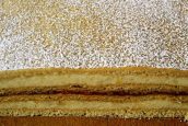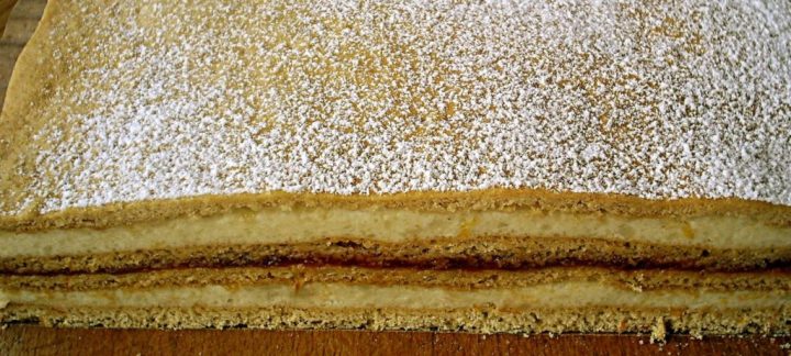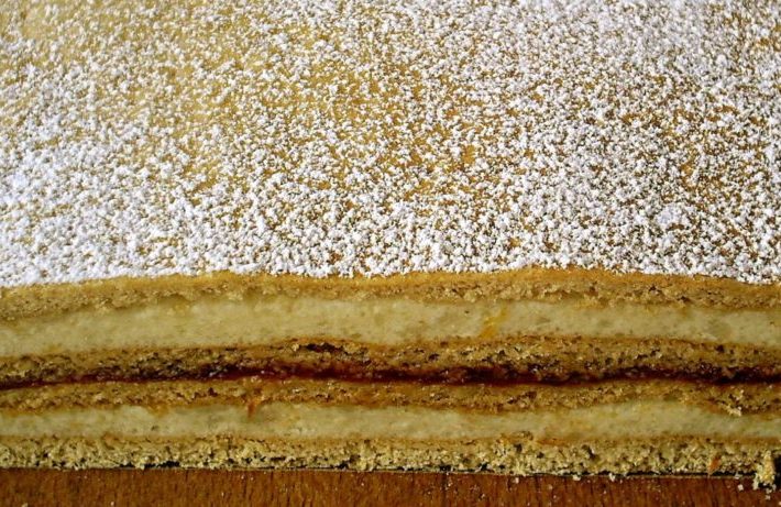 Umístěte na podnos první plát těsta a navrstvěte na něj poloviční množství vařeného krému. Na ten položte druhý plát těsta, který namažte máslovým krémem s citrónovou šťávou, pak přijde třetí plát a zbytek krému a na něj poslední plát. Vložte koláč do lednice přes noc ztuhnout a před podáváním posypejte povrch moučkovým cukrem.