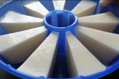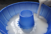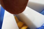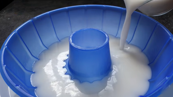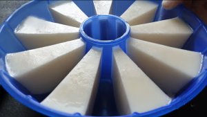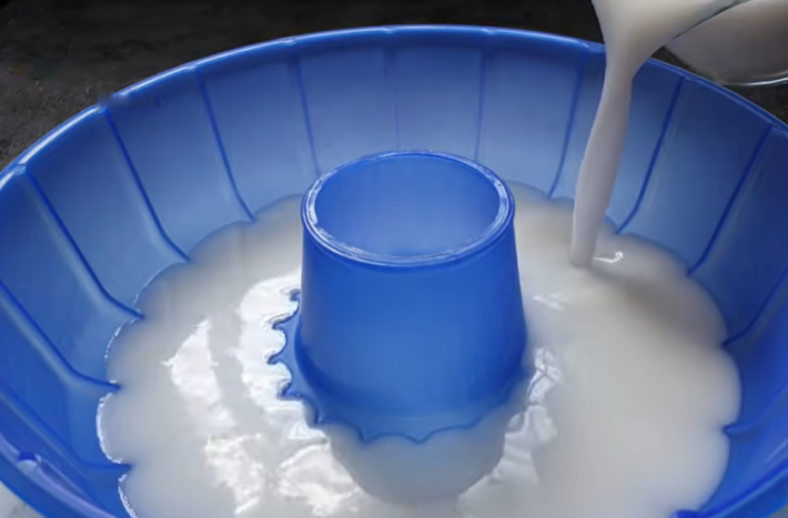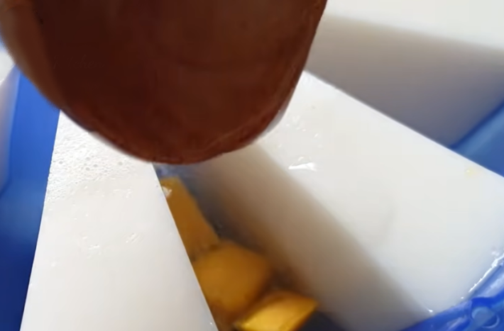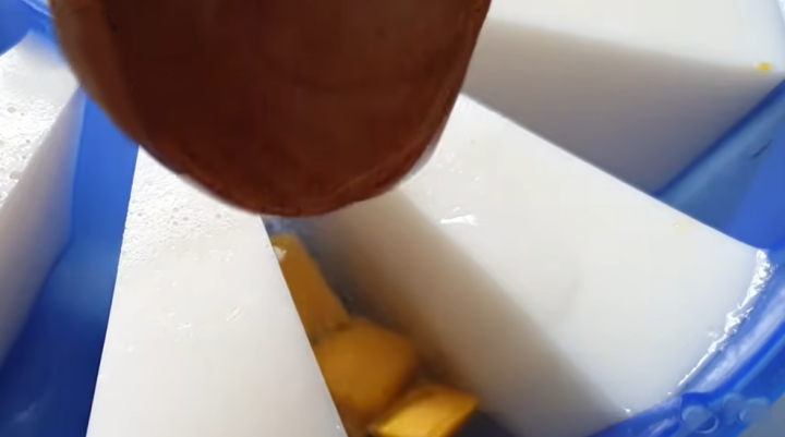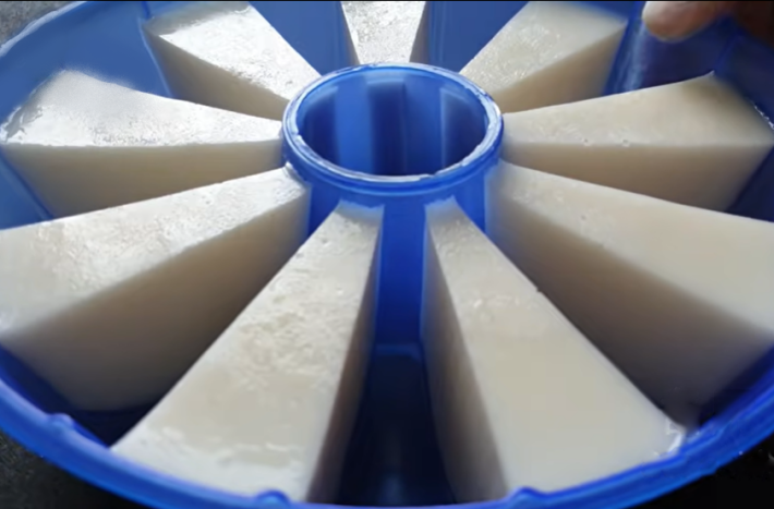 Ztuhlou bílou želatinovou hmotu vyklopte na talíř a opatrně ukrajujte malé pravidelné plátky. Ty pak naskládejte znovu do bábovkové formy tak, aby mezi jednotlivými bílými dílky byla vždy mezera. Vystačí vám tedy na dva stejné dezerty.