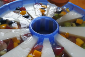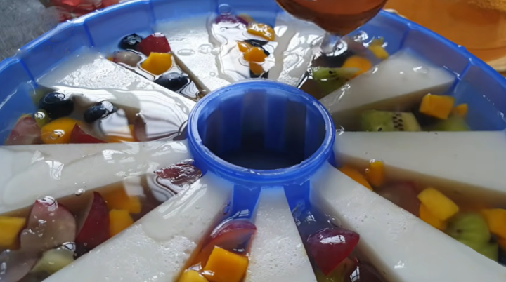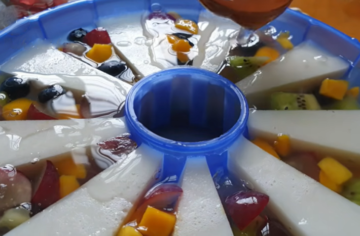 Připravené ovoce nakrájejte na malé, stejné kousky. Smíchejte několik druhů, dezert bude mít zajímavější chuť. V další misce smíchejte 600 ml vody se směsí cukru, želatinového prášku a agaru. Opět zahřejte a míchejte tak dlouho, dokud nevznikne gelovitá konzistence. Nechte trochu vychladnout, ale ne tolik, aby hmota ztuhla. Nalijte želatinu do jedné mezery v bábovkové formě asi do poloviny. Nasypte trochu ovoce a dolijte zbylou část želatinou.