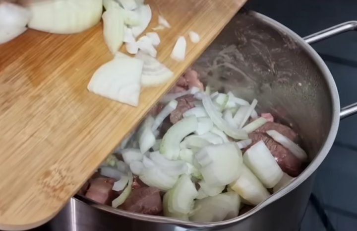 Nakrájejte slaninu na kousky, dejte ji do hrnce a pak ji 5 minut zprudka smažte. Pak přidejte na kusy nakrájené hovězí maso a smažte dalších 5 minut. Přidejte na čtvrtkolečka nakrájené cibule, nakrájenou mrkev, feferonku a česnek. Ochuťte solí, pepřem, sladkou paprikou, bazalkou a koriandrem a nechte 10 minut dusit na mírném plameni.