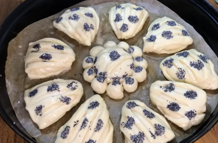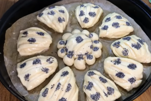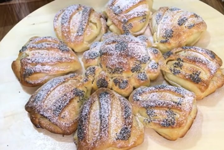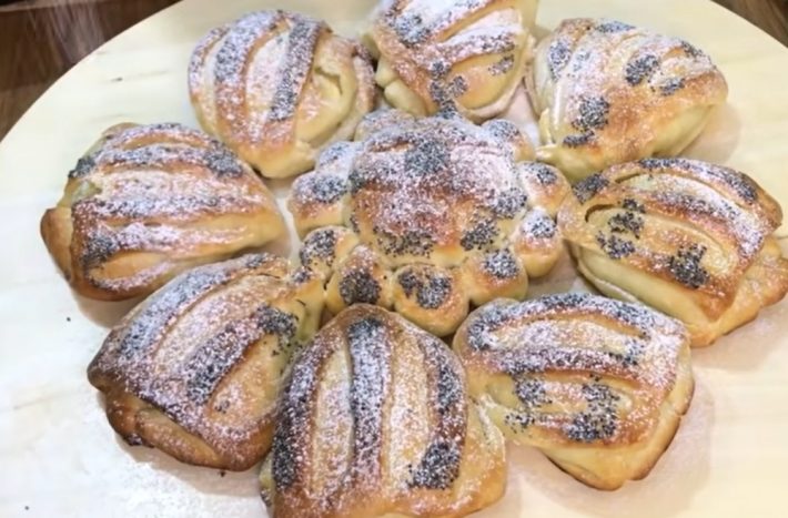 Nachystejte si kulatý plech, vystelte jej pečícím papírem a přichystané šátečky na něj vyskládejte. Pomažte je rozšlehaným žloutkem a ozdobte mákem. Troubu si rozehřejte na 180 stupňů a šátečky nechejte péct okolo 35 minut. Poté máte hotovo, šátečky můžete před podáváním posypat moučkovým cukrem. Dobrou chuť!